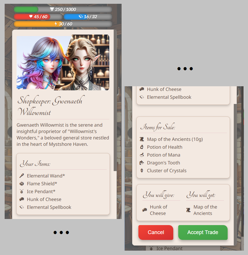 In my quest to create the perfect way to present trades, conversations, fights, and other key interactions within the game, I've been exploring various ideas. Today, I hit a breakthrough that I'm genuinely excited about – a versatile interaction modal that beautifully encapsulates all these elements in a way that feels both intuitive and immersive. It's a solution that I really like, seamlessly blending functionality with the game's rich narrative tapestry. Initially crafted for trade interactions, this versatile feature has evolved into a multi-purpose tool for various in-game interactions. Whether it's for dialogue, combat, or trade, this modal serves as a seamless interface that enriches the depth of our game.