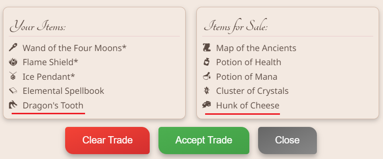 And now to introduce the new "Clear Trade" button in our Trade window, designed to give you more control over the trade. The "Accept Trade" button finalizes your trade, ensuring a smooth exchange of goods only when you're ready. And for those moments of uncertainty or change of heart? The "Clear Trade" button is your savior, resetting the trade items and allowing you to start afresh.